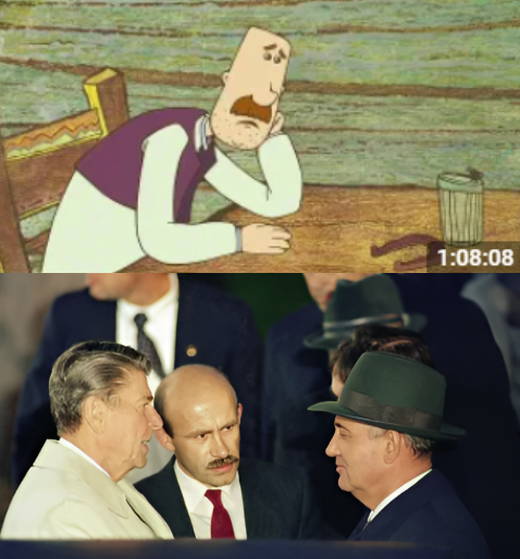 Персонаж с гранённым стаканом и Палажченко в компании Михал Сергеича и Рейгана: